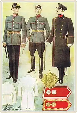 Všechny oděvní součástky byly opatřeny límcovými výložkami z červeného sukna. Výložky na límcích blůzy byly vystřiženy a v tomto místě opatřeny kovovým knoflíkem s iniciálami ČS. Hodnostní označení bylo umístěno na štítku na levém rukávu. Veškeré kovové doplňky a šňůrky byly pro strážníky a obvodní inspektory stříbřené a pro úředníky zlacené.