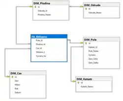 Ve schématu databáze je znázorněn model pro záznam dat ze sklizní pro zemědělský podnik. V tabulce FA_Sklizeno se uchovávají záznamy o sklizních. Konkrétně záznamy o počtu sklizených tun a výměře sekání. Dále jsou zde hodnoty cizích klíčů pro dimenze DIM_Cas, DIM_Pole, DIM_Plodina. DIM_Cas je časová dimenze; jedná se o speciální dimenzi generovanou nejčastěji automaticky. Pro tuto dimenzi není v praxi obvyklé, aby se například jednotlivé dny, nebo měsíce umísťovaly do dimenzí vyšších úrovní. Pro DIM_Pole, DIM_Plodina jsou přes cizí klíč propojeny s dimenzemi vyšší úrovně.