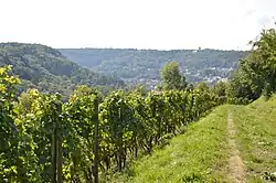 Přes vinice vede cyklostezka do Oberwiesenu a k hraničnímu přechodu na řece Wutach.