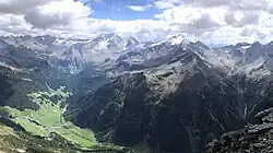 Rein in Taufers s Rieserfernergruppe - vlevo Durreck, v pozadí Hirbernock, Gabelspitze, Dreiherrnspitze, Hohe Warte, Rötspitze, Löffelspitze, Daberspitze, Dreieggspitze, Kleiner a Großer Rotstein, Mulle, Winkelspitze, Lenkstein, Barmer Spitze, Hochgall, Wildgall, Hochflachkofel, Schneebiger Nock a Gelttalspitze (zleva doprava).