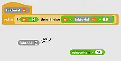 Vlastní bloky připouští sice i Scratch 3.0, ovšem jen skupiny bloků s operátory (číselnými, logickými, textovými). Ve Snapu je však možné vytvářet i vlastní bloky, které se dají použít jako operátory (faktoriál x). Uživatelský blok může využívat zadané vstupní hodnoty a taktéž odevzdávat hodnotu výstupní, tak jako například standardní blok „odmocnina z 64“, který představuje hodnotu 8. Na horním obrázku vpravo je ukázka takové uživatelsky vytvořené funkce faktoriál, která navíc využívá tzv. rekurze, tedy volá sama sebe, což je v programování dosti častý obrat. Ve spodní části obrázku je nový blok použit se zadanou vstupní hodnotou 5. Vypadá stejně jako standardní blok odmocnina. A jak je z obrázku patrné, stejně jako ve Scratchi, i zde při ladění programu stačí na blok kliknout a v bublině se ukáže jeho hodnota.