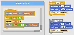 | Události | Počáteční bloky určující spouštěcí událost pro navazující posloupnost bloků | |