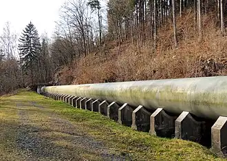 - Přívod vody z vodní nádrže do vyrovnávací komory potrubím o délce 1280 m, původně většina v délce 854,3 m ze dřeva, od roku 2010 celé potrubí ocelové