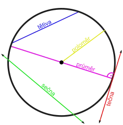 - sečna – je libovolná přímka, jejíž vzdálenost od středu kružnice je menší než poloměr R