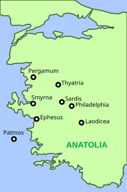 V tomto článku byl použit překlad textu z článku Seven churches of Asia na anglické Wikipedii.