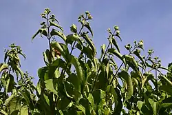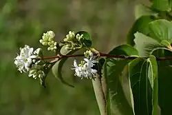 Opadavý, vzpřímeně rostoucí keř, vysoký i přes 5 m, s lysými stonky a šedobílou kůrou, jež se ve stáří odlupuje. Na mladých, červenohnědých, řídce chlupatých větvích vyrůstají vstřícně převislé, jednoduché, řapíkaté listy, 8 až 15 cm dlouhé a 5 až 9 cm široké. Jejich lesklé, kožovité, tmavozelené, vejčitě kopinaté čepele jsou na bázi uťaté, na vrcholu zašpičatělé (někdy do ocásku), po obvodě celokrajné a na rubu na třech podélných žilkách řídce chlupaté. Listy jsou bez palistů.