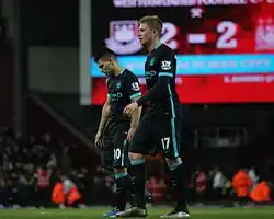 Sergio Agüero (vlevo) s ofenzivním spoluhráčem Kevinem de Bruynem v zápase s West Ham United (leden 2016)