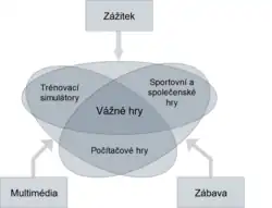 Fedwa Laamarti, Mohamad Eid a Abdulmotaleb El Saddik ve své vědecké práci definují vážnou hru jako aplikaci složenou ze tří částí: zážitek (zkušenost), zábava a multimédia. Diagram na obrázku znázorňuje i spojitost se simulátory, sportovními a společenskými hrami a počítačovými hrami.[13]