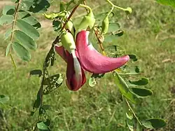 - ↑ SUN, Hang; BARTHOLOMEW, Bruce. Flora of China: Sesbania grandiflora [online]. Missouri Botanical Garden, St. Louis, MO & Harvard University Herbaria, Cambridge, MA, USA [cit. 2020-05-20]. Dostupné online. (anglicky)
