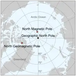 - ↑ Geomagnetism, Daily Movement of the North Magnetic Pole (archiv) [online]. Natural Resources Canada [cit. 2022-12-28]. Dostupné v archivu pořízeném dne 2010-06-25. (anglicky)