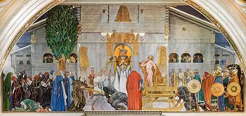 Midvinterblot, „blót o Midvinteru“, umělecká představa obětování na zimní slunovrat ve Staré Uppsale, Carl Larsson, 1915