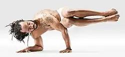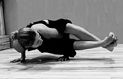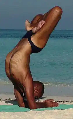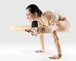 | Éka pada kounḍiṇyasana II | एकपादकौण्डिण्यासन | Kauṇḍiṇya natažená noha | rovnováha na rukou | |