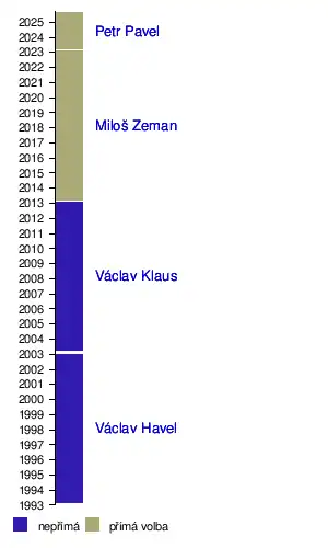 Od vzniku samostatné České republiky v roce 1993 do změny ústavy v roce 2012 probíhala volba hlavy státu nepřímo na společné schůzi obou komor Parlamentu (do ustavení Senátu v roce 1996 pak na schůzi Poslanecké sněmovny). Od roku 2013 se volba koná přímo dvoukolovým systémem.[1] Délka funkčního období prezidenta republiky je pět let,[2] nikdo nemůže být zvolen více než dvakrát za sebou.[3]