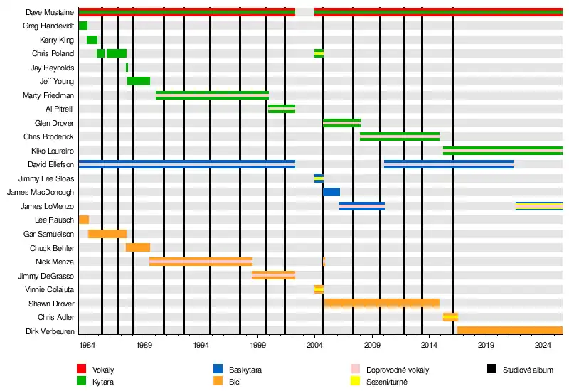| Kytara | Chris Poland | Jeff Young | Marty Friedman | Al Pitrelli | Chris Poland | Glen Drover | Chris Broderick | Kiko Loureiro | ||||||||