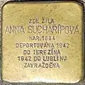 ANNA SUCHAŘÍPOVÁ NAR. 1884 DEPORTOVÁNA 1942 DO TEREZÍNA 1942 DO LUBLINU ZAVRAŽDĚNA |