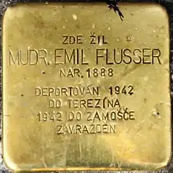 MUDR. EMIL FLUSSER NAR. 1888 DEPORTOVÁN 1942 DO TEREZÍNA 1942 DO ZAMOŠČE ZAVRAŽDĚN |