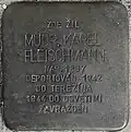 MUDR. KAREL FLEISCHMANN NAR. 1897 DEPORTOVÁN 1942 DO TEREZÍNA 1944 DO OSVĚTIMI ZAVRAŽDĚN |