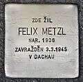 FELIX METZL NAR. 1906 ZAVRAŽDĚN 3.3.1945 V DACHAU |