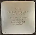 ALFRED STEINER NAR. 18.11.1875 DEPORTOVÁN 4.4.1942 DO TEREZÍNA ZAVRAŽDĚN 1942 VE VARŠAVĚ |
