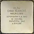EMMA KLEINOVÁ NAR. 24.3.1873 DEPORTOVÁNA 4.4.1942 DO TEREZÍNA ZAVRAŽDĚNA 1942 V TEREZÍNĚ |