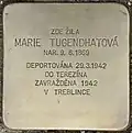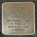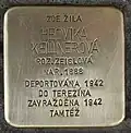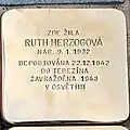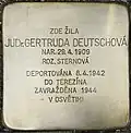 JUDr. GERTRUDA DEUTSCHOVÁ NAR. 29.4.1909 ROZ. STERNOVÁ DEPORTOVÁNA 8.4.1942 DO TEREZÍNA ZAVRAŽDĚNA 1944 V OSVĚTIMI |