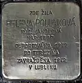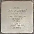 MARGITA JERALOVÁ NAR. 29.4.1896 DEPORTOVÁNA 29.3.1942 DO TEREZÍNA 25.5.1942 DO LUBLINU ZAVRAŽDĚNA 1942 V LUBLINU |