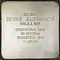 SIDONIE KAUFMANNOVÁ NAR. 8.3.1875 DEPORTOVÁNA 1942 DO TEREZÍNA ZAVRAŽDĚNA 1942 V LUBLINU |