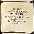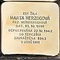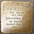 EMMA HERZOGOVÁ ROZ. TELLER NAR. 1884 DEPORTOVÁNA 1941 DO TEREZÍNA ZAVRAŽDĚNA 1944 TAMTÉŽ |