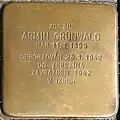 ARMIN GRÜNWALD NAR. 11.1.1895 DEPORTOVÁN 28.1.1942 DO TEREZÍNA ZAVRAŽDĚN 1942 V IZBICI |