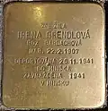 IRENA BRENDLOVÁ ROZ. BARDACHOVÁ NAR. 22.2.1907 DEPORTOVÁNA 26.11.1941 DO MINSKA ZAVRAŽDĚNA 1941 V MINSKU |