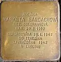 MARKÉTA BARDACHOVÁ ROZ. GOLDMANNOVÁ NAR. 29.8.1902 DEPORTOVÁNA 28.1.1942 DO TEREZÍNA ZAVRAŽDĚNA 1942 V LUBLINU |