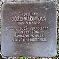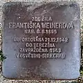 nám. F. L. Věka čp. 19 | 18. května 2023[10] | Hermína Kornfeldová rozená Löwyová se narodila 22. června 1886. Byla manželkou obchodníka Rudolfa Kornfelda, s níž měla syny Karla a Zdeňka. Rozhodla se dobrovolně ukončit život těsně před transportem do koncentračním táborů.[10] | |