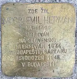 Ulrichovo náměstí čp. 762 | 2. října 2024[14] | MUDr. Emil Herman se narodil v roce 1899 v oblasti Užhorodu. Po první světové válce se rozhodl studovat medicínu v Budepešti. Maďarsko ale omezovalo počet židovských studentů na vysokých školách a Emil Herman nakonec vystudoval lékařskou fakultu v Praze. Po návratu do Užhorodu se oženil s Margit Burgerovou. V roce 1928 získal nabídku pracovat jako lékař u Československých národních drah v Hradci Králové. Nastěhovali se do nově postaveného paláce Fénix. V roce 1930 se manželům narodila dcera Věra. Emil Herman byl členem Sociálně demokratické strany a s příchodem nacismu v Německu pomáhal uprchlíkům. Po okupaci Československa rodina přesídlila do rodného Užhorodu. Mezi lety 1940–1943 se skrývali v Budapešti a na Slovensku. Na konci roku 1943 znovu prchli do Budapešti. Na začátku roku 1944 byli židé v Budapešti internováni do pevnosti v Tolonci. Emil Herman byl již bez rodiny přesunut do internačního tábora v Sárváru, kde pracoval jako vězeňský lékař. Tam se znovu setkal se svou ženou Margit a zachránil ji před transportem do Osvětimi. Při povstání ve věznici Sárvár se oběma podařilo uprchnout. Skrývali se v Budapešti, kde se díky švédskému diplomatovi Raoulu Wallenbergovi setkali s dcerou Věrou. Rodina Emila Hermana válku přežila. V roce 1947 emigrovali do USA.[17] |