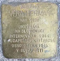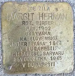 Ulrichovo náměstí čp. 762 | 2. října 2024[14] | Margit Herman rozená Burgerová se narodila v roce 1902 v oblasti Užhorodu. Ve 20. letech 20. století se provdala na lékaře Emila Hermana. Manželé žili v Hradci Králové, kde se jim narodila jediná dcera Věra. Po okupaci Československa rodina přesídlila do rodného Užhorodu. Když se situace dále vyostřovala, přesídlila rodina do Budapešti k Margitiným bratrům. S dcerou Věrou byla umístěna do internačního tábora v Kistarcse. Aniž by si byla jistá jejím dalším osudem, předala svou dceru Věru do rukou pracovníkům švédského Červeného kříže. Ženy v Kistarcse byly vypraveny transportem do Osvětimi, transport byl však odkloněn do Sárváru. Zde se Margit setkala se svým manželem Emilem, který ji zachránil před další cestou do Osvětimi. Zůstala v internáčním táboře v Sárváru, odkud při povstání s manželem prchla do Budapešti. Margit Hermanová s manželem a dcerou válku přežili, později emigrovali do USA.[17] |