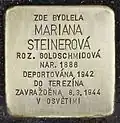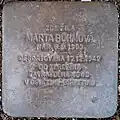 MARTA ADLEROVÁ NAR. 12. 6. 1914 DEPORTOVÁNA 18. 12. 1942 DO TEREZÍNA ZAVRAŽDĚNA 1943 V OSVĚTIMI |