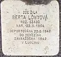 BERTA LÖWYOVÁ ROZ. SZABÓ NAR. 22. 5. 1904 DEPORTOVÁNA 22. 5. 1942 DO TEREZÍNA ZAVRAŽDĚNA 1942 V LUBLINU |