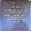 ERNESTINA BENEŠOVÁ NAR. 8. 5. 1858 DEPORTOVÁNA 22. 5. 1942 DO TEREZÍNA ZAVRAŽDĚNA 19. 8. 1942 V TEREZÍNĚ |