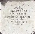 GUSTAV LÖWY NAR. 19. 5. 1935 DEPORTOVÁN 22. 5. 1942 DO TEREZÍNA ZAVRAŽDĚN 1942 V LUBLINU |