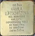 KAMILA LÜFTSCHITZOVÁ ROZ. KRAUSOVÁ NAR. 1874 DEPORTOVÁNA 1942 DO TEREZÍNA, DO OSVĚTIMI ZAVRAŽDĚNA |
