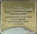 MARTA SCHWARZOVÁ NAR. 21. 9. 1890 DEPORTOVÁNA 22. 5. 1942 DO TEREZÍNA ZAVRAŽDĚNA 1942 V LUBLINU |