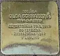 Subakova 41 | Olga Schwarzová narozená 5. 6. 1883 v Třebíči, dcera Gottfrieda Schwarze a Rosiny rozené Bondi, zůstala svobodná, bydlela v Třebíči v domě číslo 44, kde do smrti matky v r.1932 pomáhala při provozu hospody; otec zemřel v r. 1917. Někdy mezi lety 1932 -1942 se přestěhovala se sestrou Martou na adresu Tovární, dnes Subakova, číslo 41, odkud byla dne 22. 5. 1942 transportem Aw poslána do Terezína a odtud dne 25. 5. transportem Az do Lublinu, kde zahynula.[11] | |