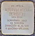 ABRAHAM ADOLF BERNSTEIN NAR. 1884 DEPORTOVÁN 1942 DO TEREZÍNA ZAVRAŽDĚN 16.10.1944 V OSVĚTIMI-BŘEZINCE |