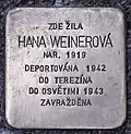 HANA WEINEROVÁ NAR. 1919 DEPORTOVÁNA 1942 DO TEREZÍNA DO OSVĚTIMI 1943 ZAVRAŽDĚNA |