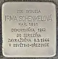 IRMA SCHENKELOVÁ NAR. 1891 DEPORTOVÁNA 1942 DO TEREZÍNA ZAVRAŽDĚNA 8.3.1944 V OSVĚTIMI-BŘEZINCE |