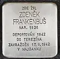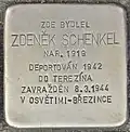 ZDENĚK SCHENKEL NAR. 1919 DEPORTOVÁN 1942 DO TEREZÍNA ZAVRAŽDĚN 8.3.1944 V OSVĚTIMI-BŘEZINCE |