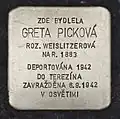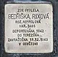 BEDŘIŠKA RIXOVÁ ROZ. RIPPELOVÁ NAR. 1885 DEPORTOVÁNA 1942 DO TEREZÍNA ZAVRAŽDĚNA 18.12.1943 V OSVĚTIMI |