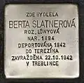 BERTA SLATNEROVÁ ROZ. LÖWYOVÁ NAR. 1894 DEPORTOVÁNA 1942 DO TEREZÍNA ZAVRAŽDĚNA 22.10.1942 V TREBLINCE |