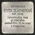 EDITA SLATNEROVÁ NAR. 1922 DEPORTOVÁNA 1942 DO TEREZÍNA ZAVRAŽDĚNA 22.10.1942 V TREBLINCE |