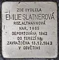 EMILIE SLATNEROVÁ ROZ. ALTMANNOVÁ NAR. 1865 DEPORTOVÁNA 1942 DO TEREZÍNA ZAVRAŽDĚNA 15.12.1943 V OSVĚTIMI |