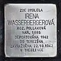 IRENA WASSERBERGEROVÁ ROZ. POLLAKOVÁ NAR. 1885 DEPORTOVÁNA 1942 DO TEREZÍNA ZAVRAŽDĚNA 22.10.1942 V TREBLINCE |